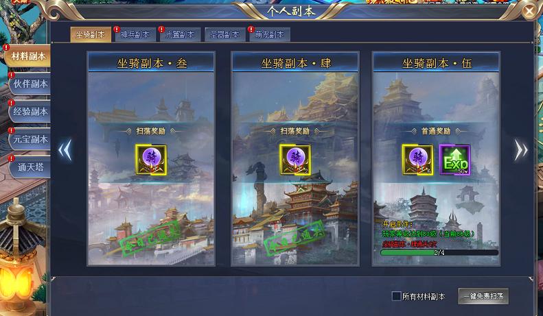 材料副本包括:坐骑、光翼、神兵、仙迹、圣器副本,每个副本又分为壹、贰、叁……共九个等级,每天每个副本可进入1次。挑战后消耗元宝可重置并扫荡,并返还绑定元宝。由于难度系数的不同,开启条件也跟玩家的等级有关。